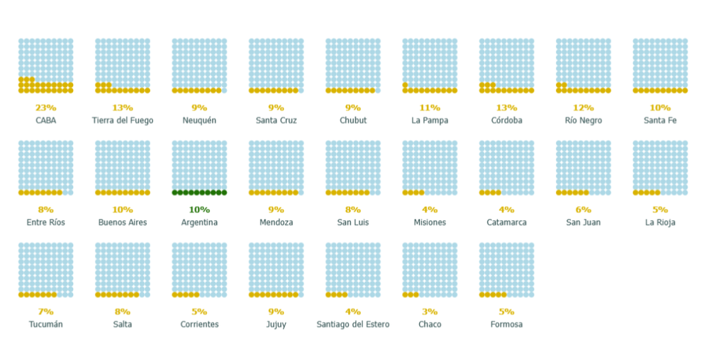 La jurisdicción con el mejor Índice de Resultados Escolares en 2024 es CABA (donde el 23% de los estudiantes llega al final de la secundaria en tiempo y forma), seguida por Tierra del Fuego y Córdoba (ambas con 13%). Las provincias que presentan las cifras más bajas son Chaco (3%) y Santiago del Estero, Misiones y Catamarca (todas con 4%).