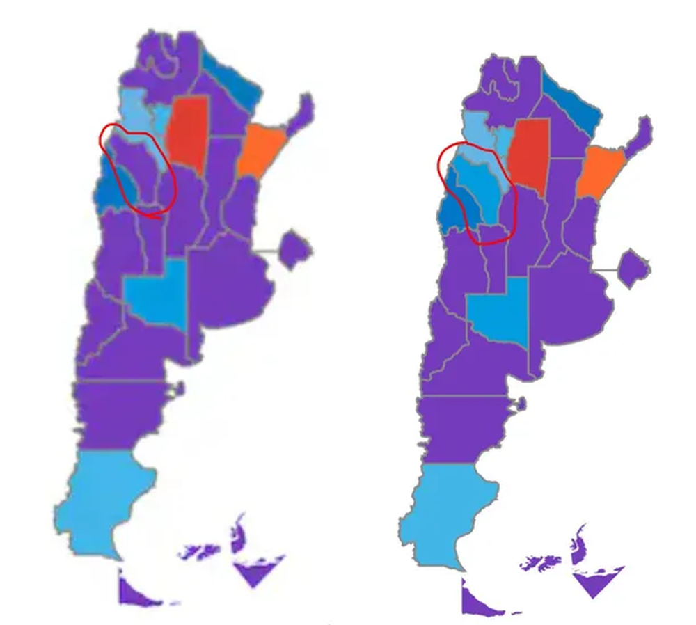 Resulta que el domingo, el Gobierno mostró los resultados parciales cuando el conteo lo tenía como gran ganador. Entonces, esa provincia se había "pintado" de violeta, y así quedó incluso hasta el lunes, ya que se había detenido la carga de datos.