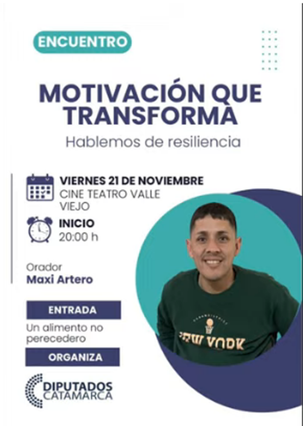 "Motivación que transforma" será presentado por Maxi Artero en el cine teatro de Valle Viejo