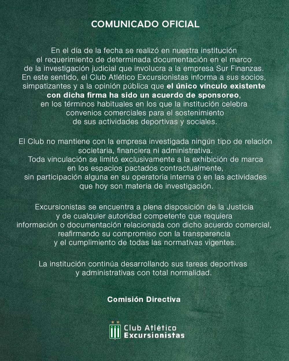 “Excursionistas se encuentra a plena disposición de la Justicia y de cualquier autoridad competente que requiera información o documentación relacionada con dicho acuerdo comercial, reafirmando su compromiso con la transparencia y el cumplimiento de todas las normativas vigentes”, cerraron.