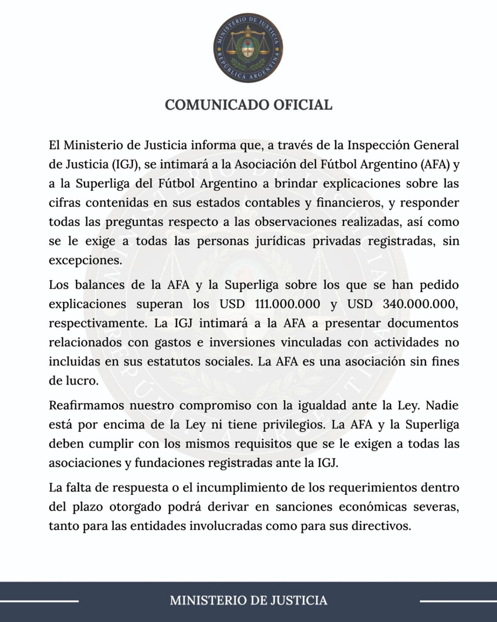 Y completaron: “Reafirmamos nuestro compromiso con la igualdad ante la Ley. Nadie está por encima de la Ley ni tiene privilegios. La AFA y la Superliga deben cumplir con los mismos requisitos que se le exigen a todas las asociaciones y fundaciones registradas ante la IGJ. La falta de respuesta o el incumplimiento de los requerimientos dentro del plazo otorgado podrá derivar en sanciones económicas severas, tanto para las entidades involucradas como para sus directivos”.
